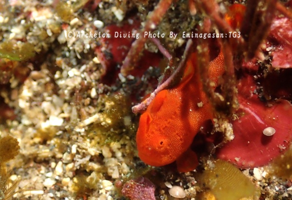 オレンジのイロカエルアンコウ、いつもの海藻に包まって