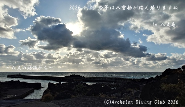 2026/1/25☀☁🌂⛄ 八重根 水温19.1℃ 透視度12m 気温4.2-8.8℃ 風:西北西(Max19.5m/s)