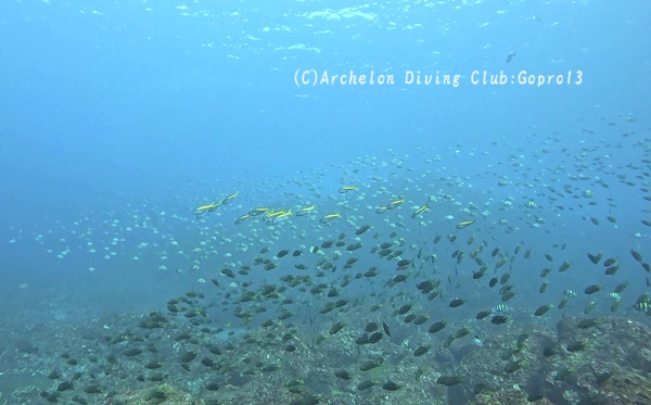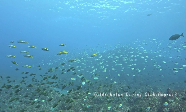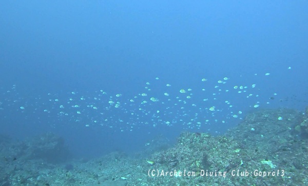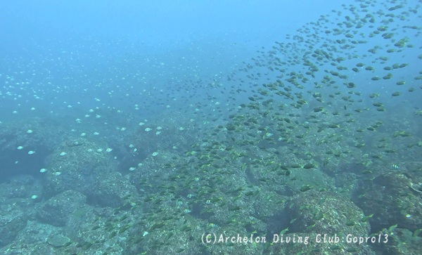 内側にいた、スズメダイ達やウメイロモドキ、タカサゴ達もみんなビビりまくってごちゃちゃちゃっと水底に避難。