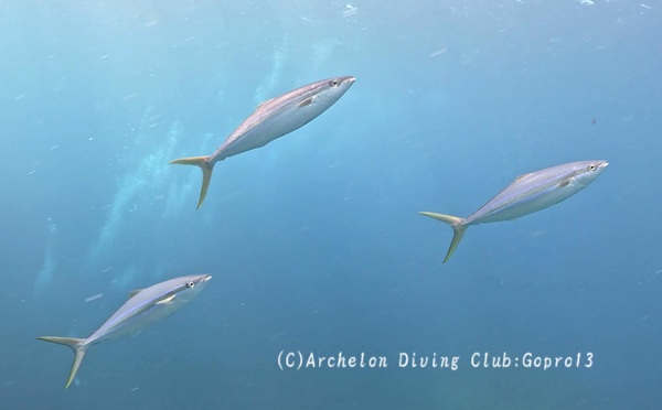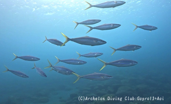 青物:シマアジの若魚の群れ数匹 ヒレナガカンパチ ムロアジ群れ