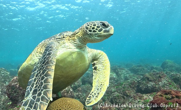 ドボンと入ると、アオウミガメだらけ。