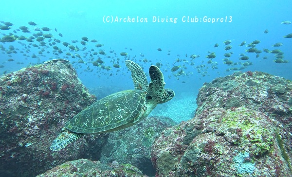 キホシスズメダイの魚群をかき分けてアオウミガメ!