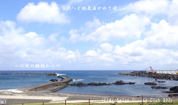 今日の八丈島は、昨晩通過した低気圧の影響で南西側は時化、東側はうねりはありますが、強風吹きおろしの風でなんとか潜れる状態に。